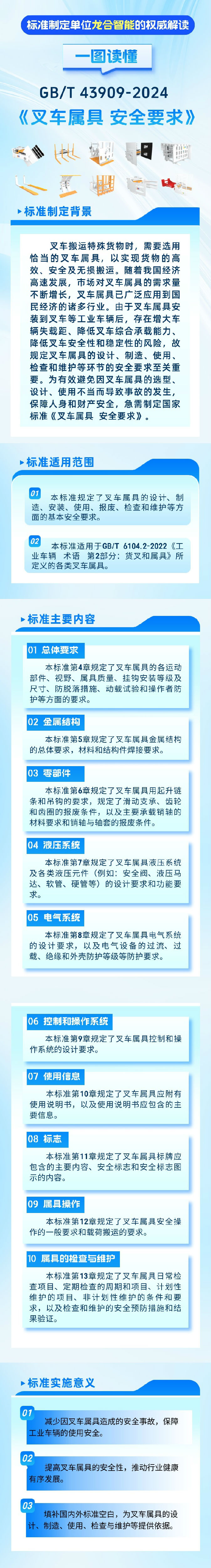 龍合智能裝備制造有限公司自2017年3月開始擔任屬具工作組組長單位以來,在上級標委會的指導下、在全體組員的共同努力下,卓有成效地開展了許多工作,為促進我國工業(yè)車輛標準體系建設和促進行業(yè)整體技術進步做出了積極貢獻。截至目前,我國工業(yè)車輛屬具專業(yè)領域共有現(xiàn)行有效標準20項(其中國家標準3項,行業(yè)標準17項);已完成報批待批準的行業(yè)標準7項;在研的屬具標準制修訂計劃項目共8項(其中國家標準2項、行業(yè)標準6項)。